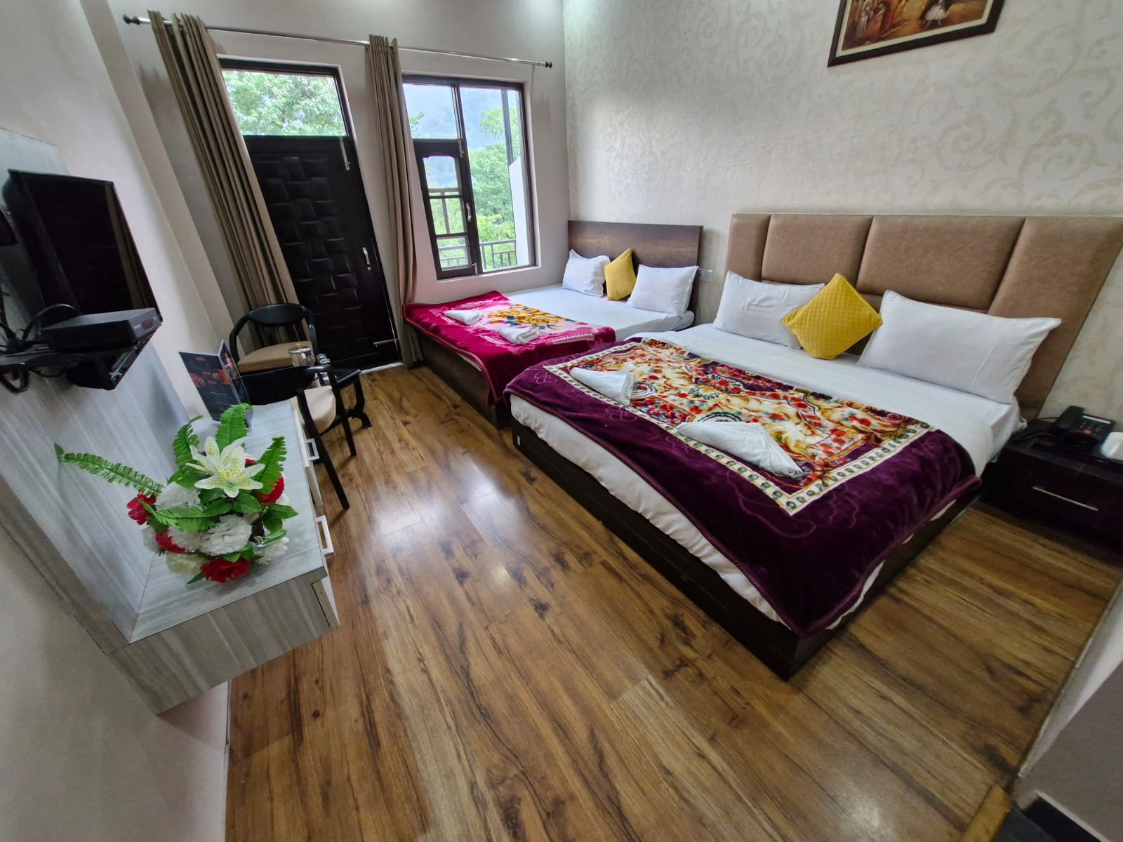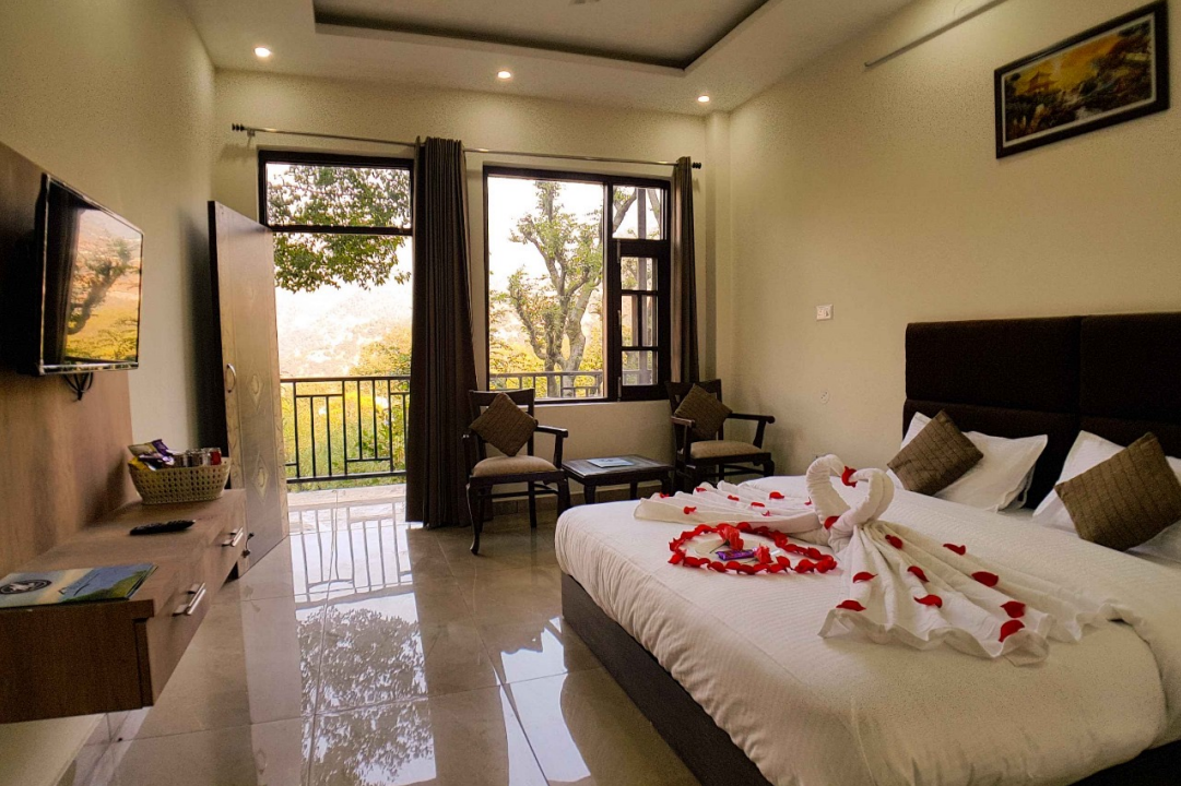 The Superior Rooms at Merriment Hotel, Dalhousie, with balconies, offer a charming blend of comfort and elegance along with breathtaking views of the surrounding landscapes. These rooms are tastefully designed with modern decor, soft lighting, and high-quality furnishings to ensure a relaxing ambiance.